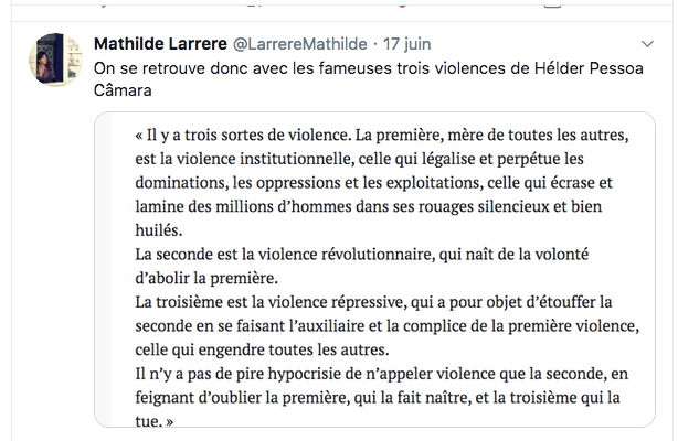 Ce que j’avais à dire et que j’ai dit cent fois, c’est qu’aucun changement vital et radical ne se fera dans l’angélisme, avec des fleurs autour et que face à la violence sociale, policière, culturelle, médiatique, morale, et qui appelle, bien décomplexé de la gâchette, à tirer dans le tas, seule la violence populaire et légitime peut être redoutable.